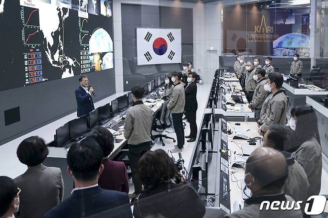 (고흥=뉴스1) 이광호 기자 = 문재인 대통령이 21일 오후 전남 고흥 나로우주센터 연구동에서 한국형 발사체 '누리호(KSLV-II)' 발사 참관을 마치고 발사통제관리실을 찾아 연구원들을 격려하고 있다. 2021.10.21/뉴스1
