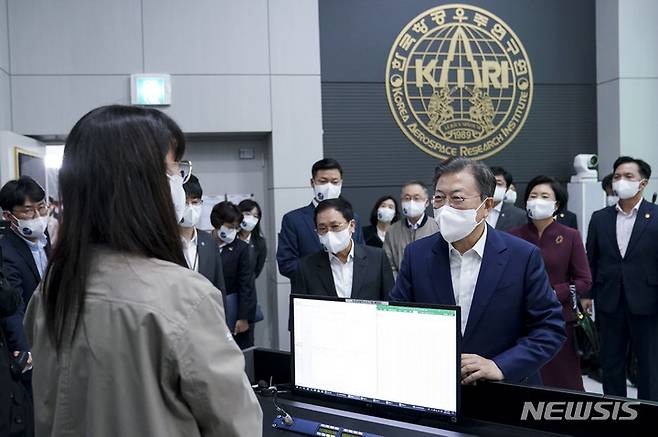 [고흥=뉴시스] 전진환 기자 = 문재인 대통령이 21일 오후 한국형 발사체 '누리호(KSLV-2)'의 발사 참관을 마치고 전남 고흥 나로우주센터 발사통제관리실을 찾아 연구원들을 격려하고 있다. 2021.10.21. amin2@newsis.com