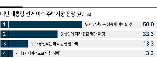 이 밖에 ‘당선인에 따라 집값 영향이 클 것’(33.3%), ‘누가 당선되든 하락 반전이 불가피할 것’(13.3%) 등이 뒤를 이었다. 김진유 경기대 도시교통공학과 교수는 “규제 완화냐, 더 센 규제냐에 따라 시장 흐름이 달라질 것으로 보인다”고 했다.