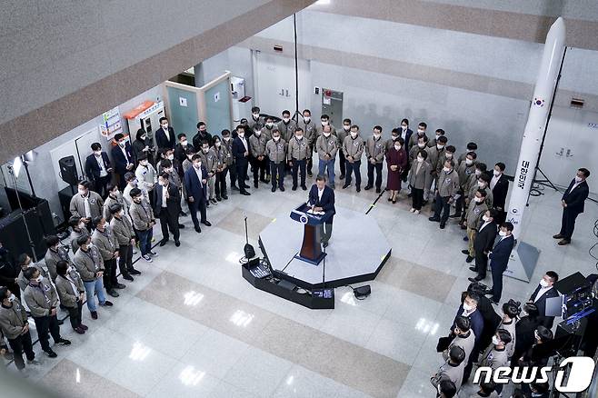 (고흥=뉴스1) 이광호 기자 = 문재인 대통령이 21일 오후 전남 고흥 나로우주센터에서 한국형 발사체 '누리호(KSLV-II)' 발사 참관을 마치고 대국민 메시지를 발표하고 있다. 2021.10.21/뉴스1