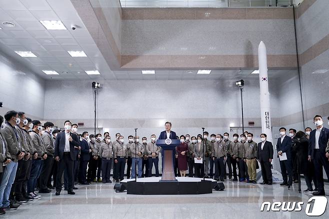 (고흥=뉴스1) 이광호 기자 = 문재인 대통령이 21일 오후 전남 고흥 나로우주센터에서 한국형 발사체 '누리호(KSLV-II)' 발사 참관을 마치고 대국민 메시지를 발표하고 있다. 2021.10.21/뉴스1