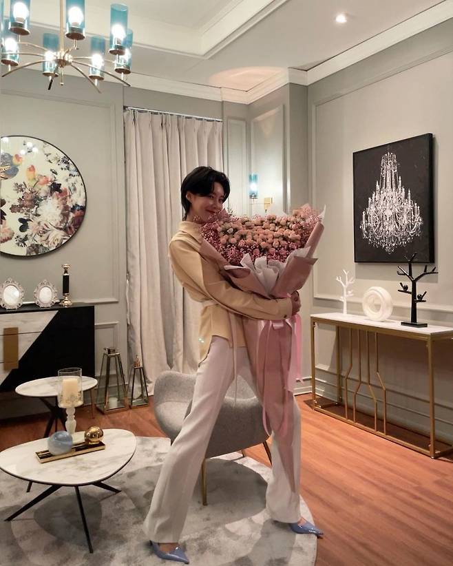 공개된 사진엔 꽃다발을 한아름 안고 있는 장도연의 모습이 담겼다. 장도연의 큰 키만큼 팔 한가득 거대한 꽃다발이 눈길을 끈다.