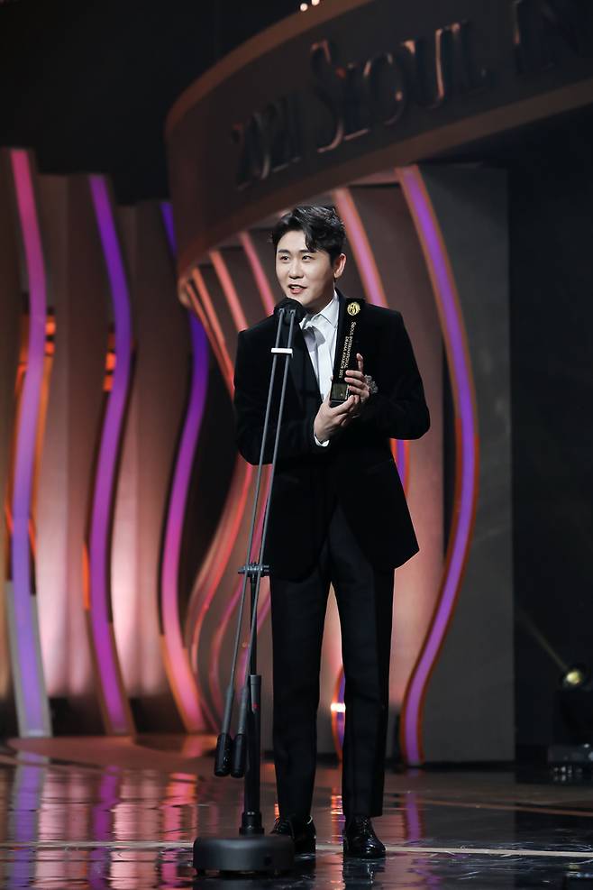 [서울=뉴시스] 박진희 기자 = 가수 영탁이 21일 서울 마포구 상암 MBC 공개홀에서 '서울드라마어워즈 2021' 시상식에 참석하여 한류드라마 OST상을 수상하고 있다. (사진=서울드라마어워즈조직위원회 제공) 2021.10.21. photo@newsis.com *재판매 및 DB 금지