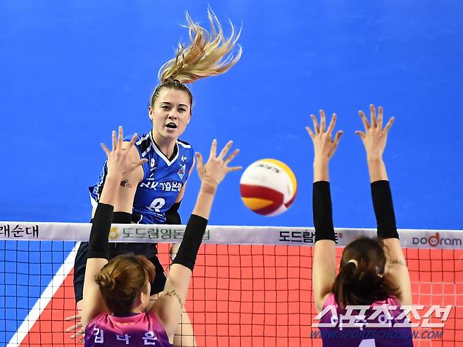 2021-2022 V리그 여자부 IBK기업은행과 흥국생명의 경기가 21일 화성실내체육관에서 열렸다. IBK기업은행 라셈이 블로킹을 피해 공격을 시도하고 있다. 화성=박재만 기자 pjm@sportschosun.com/2021.10.21/