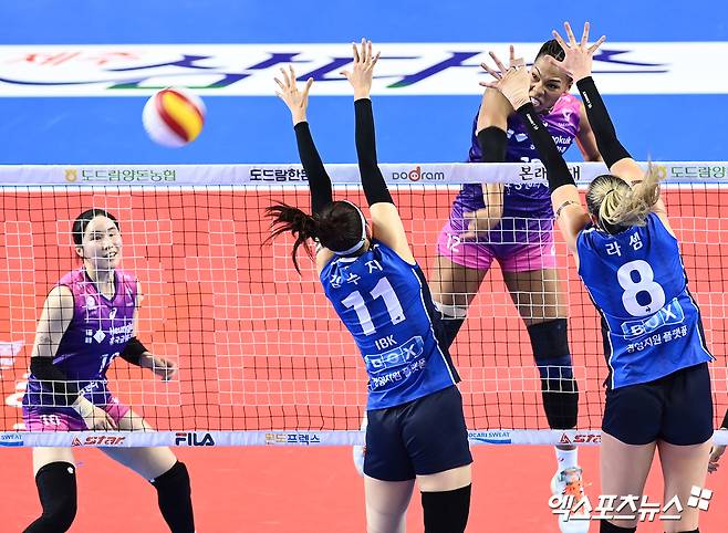 (엑스포츠뉴스 화성, 고아라 기자) 21일 경기 화성종합경기타운 실내체육관에서 열린 '2021-2022 도드람 V리그' 여자부 IBK기업은행과 흥국생명의 경기, 흥국생명 캣벨이 공격을 시도하고 있다.