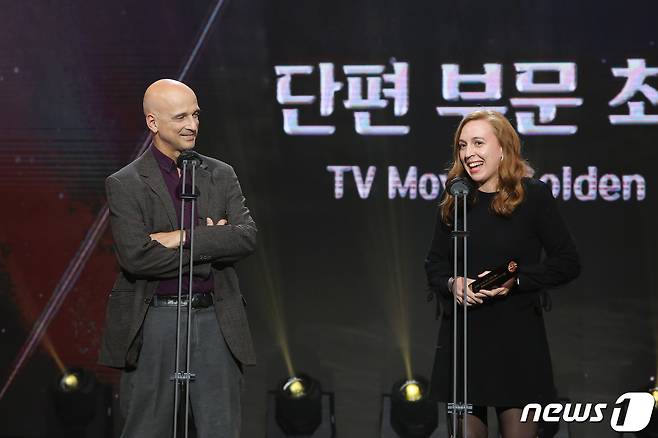 (서울=뉴스1) = 프레더리카 몬시니, 더 우먼 후 스픽스가 21일 오후 서울 마포구 상암 MBC 공개홀에서 열린 '서울드라마어워즈 2021'에 참석해 단편부문 최우수상을 수상한 뒤 소감을 말하고 있다. (서울드라마어워즈 제공) 2021.10.21/뉴스1