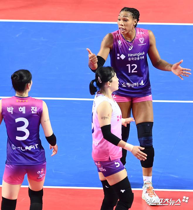 (엑스포츠뉴스 화성, 고아라 기자) 21일 경기 화성종합경기타운 실내체육관에서 열린 '2021-2022 도드람 V리그' 여자부 IBK기업은행과 흥국생명의 경기, 흥국생명 캣벨이 득점한 뒤 세리머니를 하고 있다.