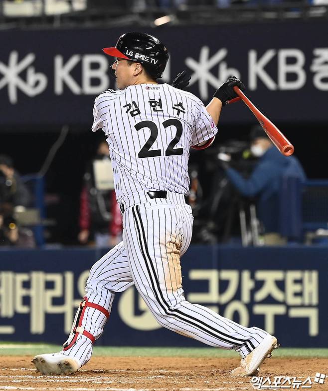 (엑스포츠뉴스 잠실, 박지영 기자) 21일 오후 서울 송파구 잠실야구장에서 열린 '2021 신한은행 SOL KBO리그' 키움 히어로즈와 LG 트윈스의 경기, 6회말 2사 1,2루 LG 김현수가 1타점 적시타를 때려내고 있다.