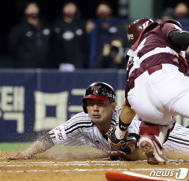 (서울=뉴스1) 김진환 기자 = 21일 오후 서울 잠실야구장에서 열린 '프로야구 2021 신한은행 SOL KBO리그' 키움히어로즈와 LG트윈스의 경기 LG 서건창이 6회말 2사 1,2루에서 김현수의 안타 때 홈으로 쇄도했으나 태그아웃 당하고 있다. LG측 요청으로 비디오판독을 실시했으나 판정이 번복되지 않았다. 2021.10.21/뉴스1