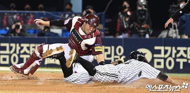(엑스포츠뉴스 잠실, 박지영 기자) 21일 오후 서울 송파구 잠실야구장에서 열린 '2021 신한은행 SOL KBO리그' 키움 히어로즈와 LG 트윈스의 경기, 6회말 2사 1,2루 LG 김현수의 1타점 적시타 때 1루주자 서건창이 홈으로 쇄도하자 키움 포수 김재현이 태그아웃을 하고 있다. 이후 LG측 요청으로 비디오 판독 실시 결과 원심 유지.