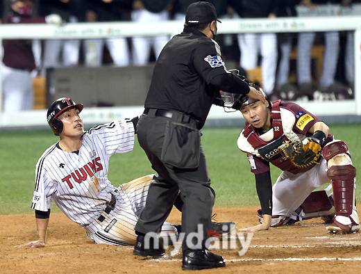 [마이데일리 = 유진형 기자] LG 1루주자 서건창이 21일 오후 서울 잠실야구장에서 진행된 '2021 신한은행 SOL KBO리그' LG 트윈스와 키움 히어로즈의 경기 6회말 2사 1.2루서 김현수의 안타때 홈에서 아웃된 뒤 아쉬워하고 있다.