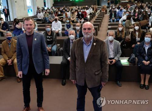 epa09535990 Spanish chef Jose Andres (C) and World Central Kitchen NGO Executive Director, Nate Mook (L) attend a event with high school students in the framework of events held for Princess of Asturias Awards in Oviedo, northern Spain, 21 October 2021. Jose Andres and World Central Kitchen won the 2021 Princess of Asturias Award for Concord. The awarding ceremony will be held on 22 October at Campoamor Theater in Oviedo. EPA/Eloy Alonso