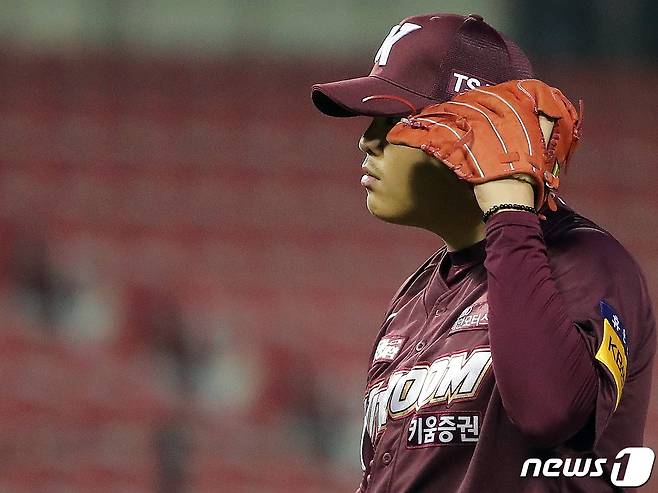 (서울=뉴스1) 김진환 기자 = 21일 오후 서울 잠실야구장에서 열린 '프로야구 2021 신한은행 SOL KBO리그' 키움히어로즈와 LG트윈스의 경기 키움 한현희가 6회말 2사 1루에서 서건창에게 볼넷을 허용한 후 포수 김재현에게 아쉬운 제스처를 취하고 있다. 2021.10.21/뉴스1