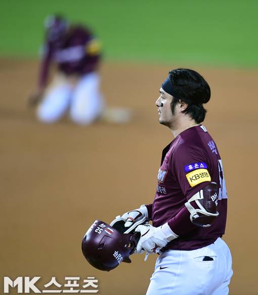 7회 초 1사 1,2루에서 키움 박병호가 병살타를 친 후 아쉬워하고 있다.