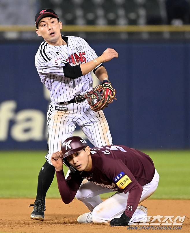 2021 KBO리그 키움 히어로즈와 LG 트윈스의 경기가 21일 잠실야구장에서 열렸다. 7회초 1사 1,2루 키움 박병호의 내야땅볼�� 1루주자 이정후가 2루 포스아웃되고 있다. LG 2루수는 서건창. 잠실=허상욱 기자 wook@sportschosun.com/2021.10.21/