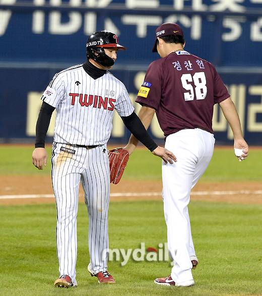 [마이데일리 = 유진형 기자] 키움 선발투수 정찬헌이 21일 오후 서울 잠실야구장에서 진행된 '2021 신한은행 SOL KBO리그' LG 트윈스와 키움 히어로즈의 경기 5회말 투구를 마친 뒤 LG 오지환과 서로를 격려하고 있다.