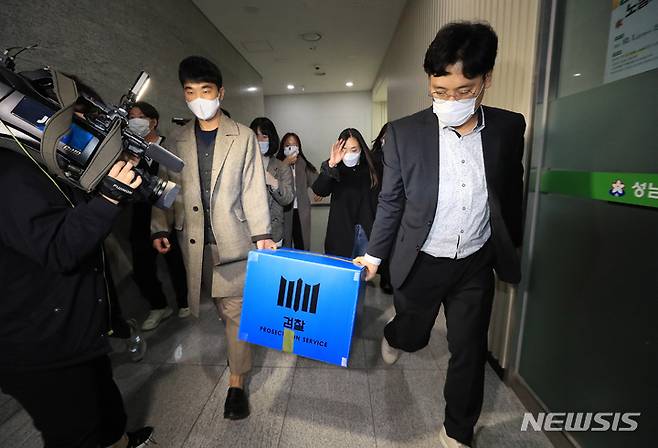 [성남=뉴시스] 김종택기자 = 대장동 로비·특혜 의혹 사건을 수사중인 검찰이 21일 오후 경기도 성남시청 시장실에서 압수수색을 마친 뒤 압수품을 옮기고 있다. 2021.10.21.