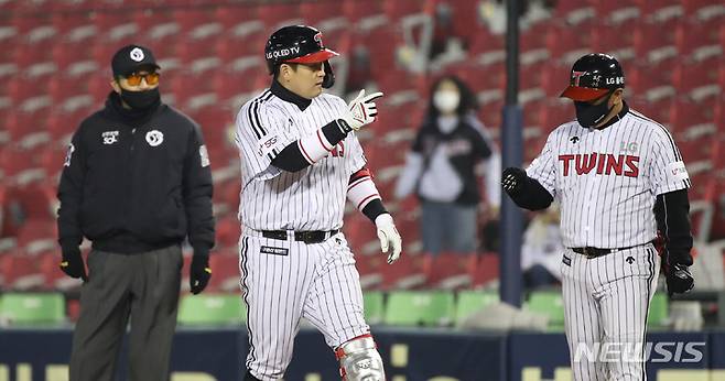 [서울=뉴시스] 고범준 기자 = 21일 오후 서울 송파구 잠실야구장에서 열린 2021 KBO리그 키움 히어로즈와 LG 트윈스 경기, 6회말 무사 주자없는 상황 LG 유강남이 안타를 치고 세리머니를 하고 있다. 2021.10.21. bjko@newsis.com