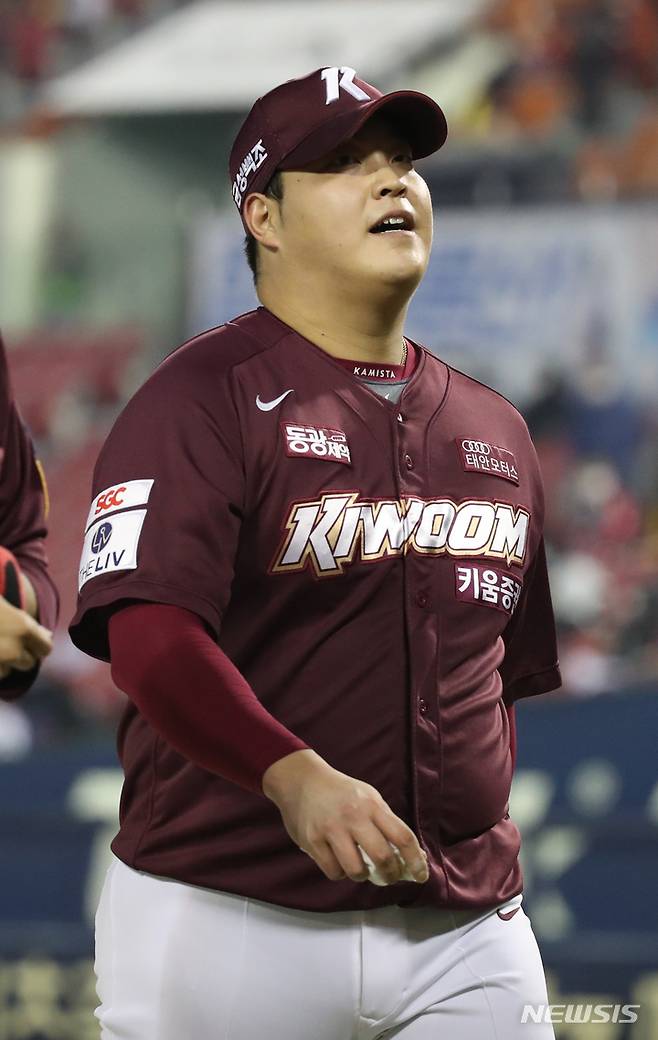 [서울=뉴시스] 고범준 기자 = 21일 오후 서울 송파구 잠실야구장에서 열린 2021 KBO리그 키움 히어로즈와 LG 트윈스 경기, 7회말을 마친 키움 조상우가 덕아웃을 향하고 있다. 2021.10.21. bjko@newsis.com