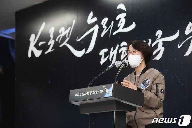 (서울=뉴스1) 박지혜 기자 = 임혜숙 과학기술정보통신부 장관이 21일 오후 전라남도 고흥군 나로우주센터 프레스룸에서 '누리호 발사 결과' 관련 브리핑을 하고 있다. (과학기술정보통신부 제공) 2021.10.21/뉴스1