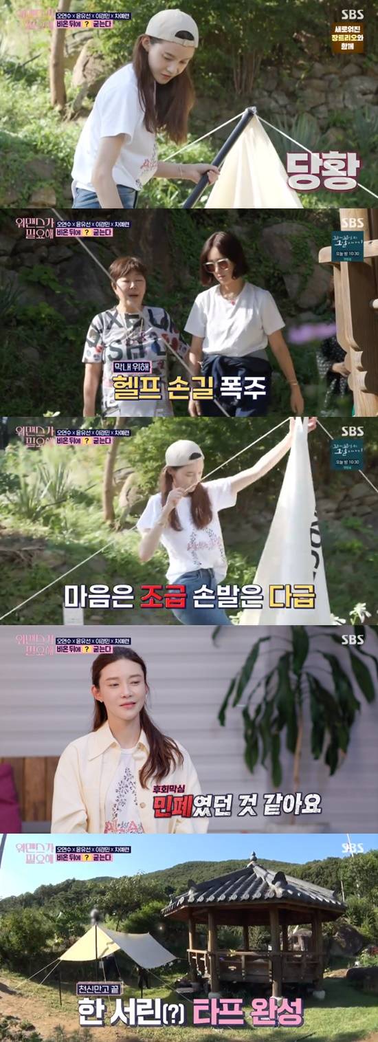 언니들의 도움에도 불구하고 타프 설치는 쉽지 않았다. 시간이 길어질수록 분위기는 어두워졌다. 이때 이경민은 서서 졸다가 휘청거리는 모습을 보였다. 이경민의 모습에 윤유선과 오연수는 웃음을 터뜨렸다. 천신만고 끝에 타프가 완성됐다.