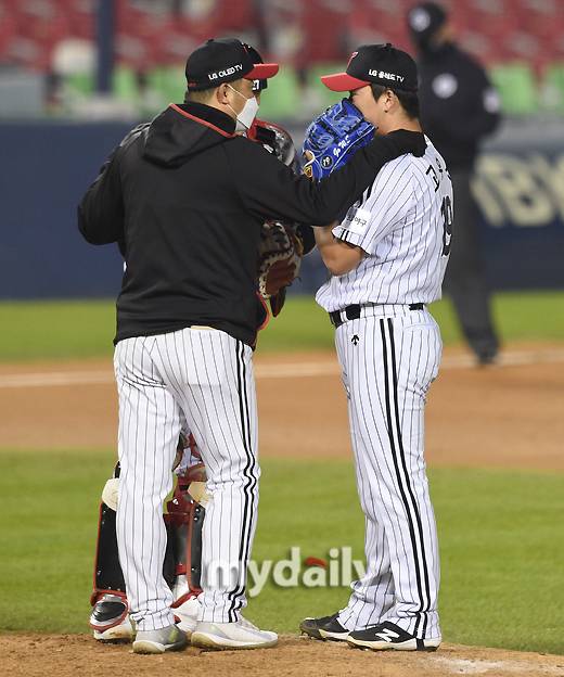 [마이데일리 = 유진형 기자] LG 고우석이 21일 오후 서울 잠실야구장에서 진행된 '2021 신한은행 SOL KBO리그' LG 트윈스와 키움 히어로즈의 경기 9회초 2사 1.2루 위기에서 경헌호 투수코치의 조언을 듣고 있다.