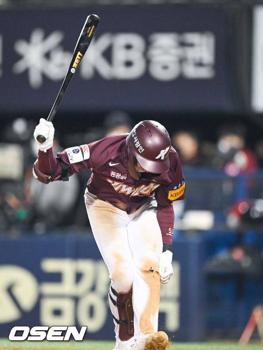 1루수 라인드라이브 이후 방망이 내려치는 이정후 [사진]
