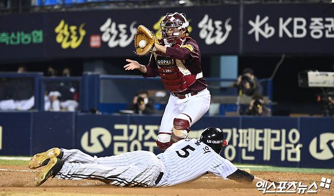 (엑스포츠뉴스 잠실, 박지영 기자) 21일 오후 서울 송파구 잠실야구장에서 열린 '2021 신한은행 SOL KBO리그' 키움 히어로즈와 LG 트윈스의 경기, 9회말 무사 3루 LG 서건창의 1타점 희생플라이 때 3루주자 김용의가 태그업을 시도, 키움 포수 이지영의 태그를 피해 홈으로 쇄도하며 득점을 올리고 있다.