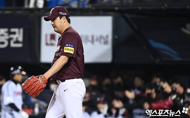 9회말 무사 3루 키움 투수 김태훈이 LG 서건창에게 동점 1타점 희생플라이를 허용한 뒤 고개를 떨구고 있다.