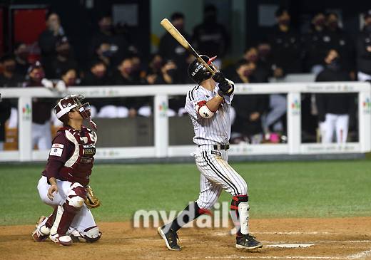 [마이데일리 = 유진형 기자] LG 서건창이 21일 오후 서울 잠실야구장에서 진행된 '2021 신한은행 SOL KBO리그' LG 트윈스와 키움 히어로즈의 경기 9회말 무사 3루서 동점 희생플라이를 치고 있다.