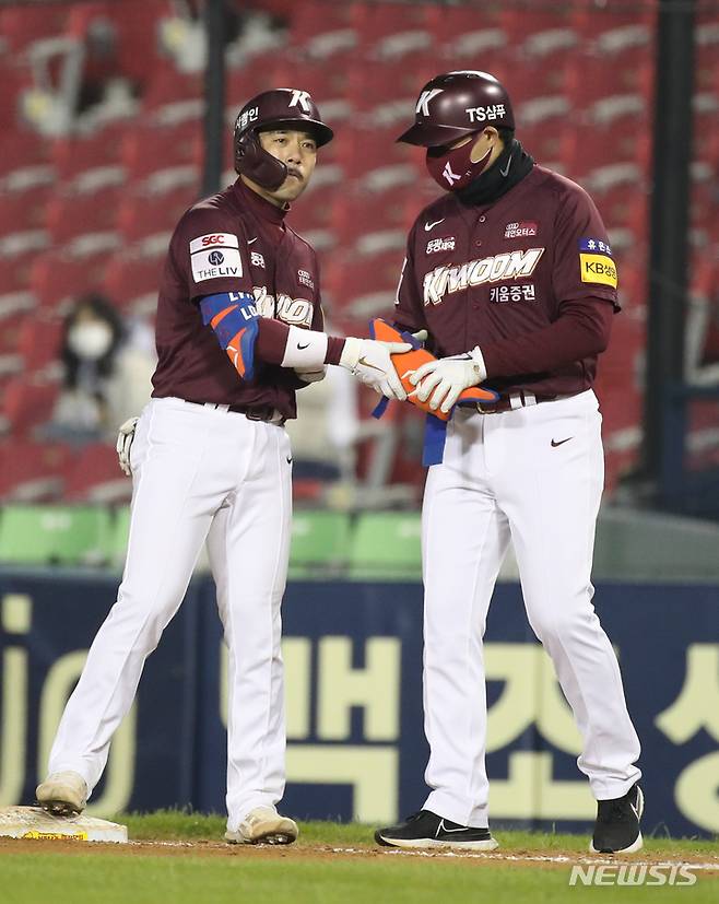 [서울=뉴시스] 고범준 기자 = 21일 오후 서울 송파구 잠실야구장에서 열린 2021 KBO리그 키움 히어로즈와 LG 트윈스 경기, 9회초 2사 주자없는 상황 키움 이용규가 안타를 치고 코치에게 보호대를 건네고 있다. 2021.10.21. bjko@newsis.com