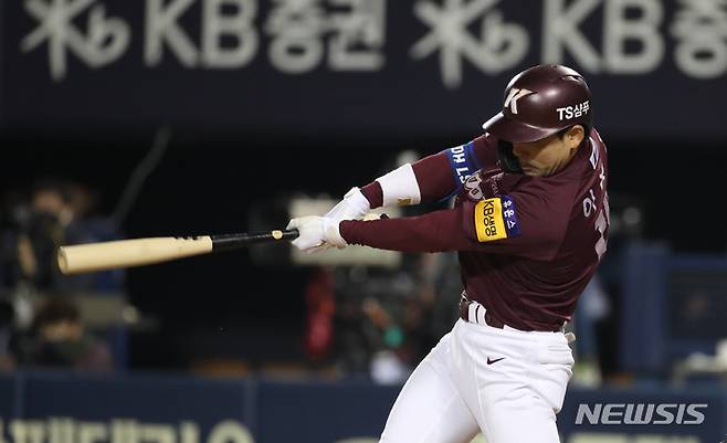 [서울=뉴시스] 고범준 기자 = 21일 오후 서울 송파구 잠실야구장에서 열린 2021 KBO리그 키움 히어로즈와 LG 트윈스 경기, 9회초 2사 주자없는 상황 키움 이용규가 안타를 치고 있다. 2021.10.21. bjko@newsis.com