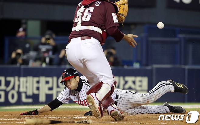 (서울=뉴스1) 김진환 기자 = 21일 오후 서울 잠실야구장에서 열린 '프로야구 2021 신한은행 SOL KBO리그' 키움히어로즈와 LG트윈스의 경기 LG 김용의가 9회말 무사 3루에서 서건창의 외야 플라이 때 홈으로 쇄도해 동점 득점에 성공하고 있다. 2021.10.21/뉴스1