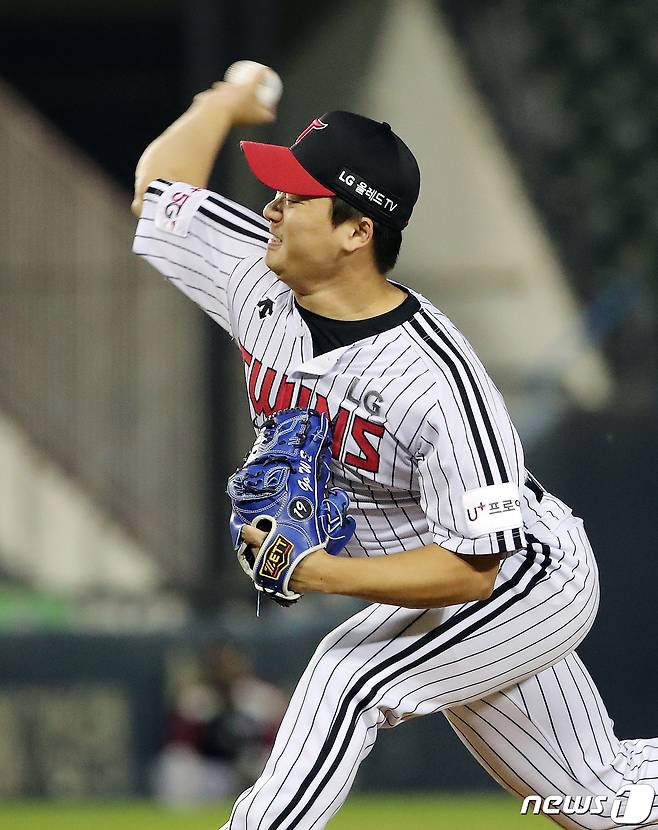 (서울=뉴스1) 김진환 기자 = 21일 오후 서울 잠실야구장에서 열린 '프로야구 2021 신한은행 SOL KBO리그' 키움히어로즈와 LG트윈스의 경기 LG 마무리 고우석이 9회초 등판해 힘차게 공을 던지고 있다. 2021.10.21/뉴스1