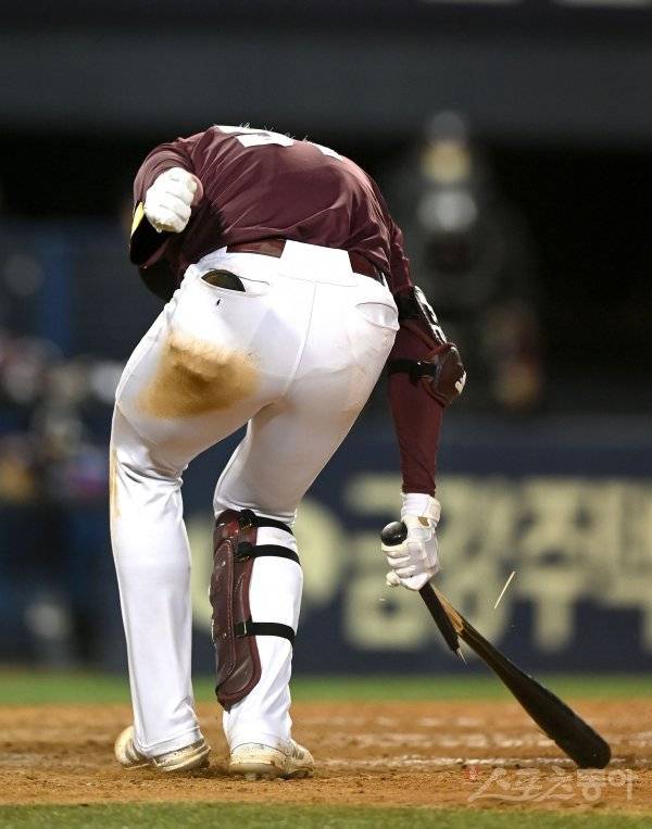 21일 서울 잠실야구장에서 ‘2021 신한은행 SOL KBO리그’ 키움 히어로즈와 LG 트윈스 경기가 열렸다. 9회초 2사 1,2루 키움 이정후가 1루수 직선타로 아웃된 후 배트를 부러뜨리고 있다.