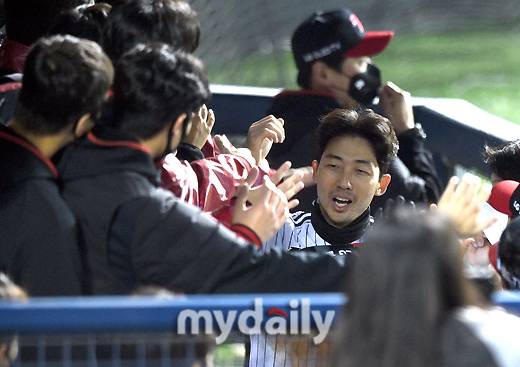 [마이데일리 = 유진형 기자] LG 김용의가 21일 오후 서울 잠실야구장에서 진행된 '2021 신한은행 SOL KBO리그' LG 트윈스와 키움 히어로즈의 경기 9회말 무사 3루서 서건창의 좌익수플라이때 홈을 밟은 뒤 동료들의 축하를 받고 있다.