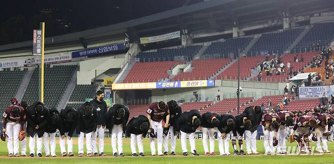 [서울=뉴시스] 고범준 기자 = 21일 오후 서울 송파구 잠실야구장에서 열린 2021 KBO리그 키움 히어로즈와 LG 트윈스 경기, 5-5 동점 경기를 마친 키움 선수들이 인사를 하고 있다. 2021.10.21. bjko@newsis.com
