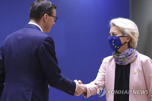 Poland's Prime Minister Mateusz Morawiecki, left, shakes hands with European Commission President Ursula von der Leyen during a round table meeting at an EU summit in Brussels, Thursday, Oct. 21, 2021. European Union leaders head into a standoff between Poland and most of the other EU member nations over the rule of law in the eastern member state. Other issues for the 27 EU leaders include climate change, the energy crisis, COVID-19 developments and migration. (Yves Herman, Pool Photo via AP) POOL PHOTO