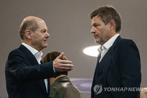 epa09536179 German Minister of Finance and Social Democratic Party (SPD) top candidate for the federal elections Olaf Scholz (L) and Green party (Die Gruenen) co-chairman Robert Habeck talk during the beginning of coalition talks between the Free Democratic Party (FDP), The Greens (Buendnis 90/Die Gruenen) and the Social Democratic Party (SPD), in Berlin, Germany, 21 October 2021. Greens, SPD and FDP meet in order to forma a government coalition after Germany's recent parliamentary election. EPA/CLEMENS BILAN