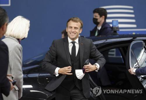 French President Emmanuel Macron arrives for an EU summit at the European Council building in Brussels, Thursday, Oct. 21, 2021. European Union leaders will discuss issues including climate change, the energy crisis, COVID-19 developments and migration. (AP Photo/Olivier Matthys, Pool) POOL PHOTO