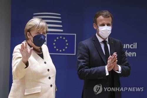 Germany's Chancellor Angela Merkel, left, and French President Emmanuel Macron arrive for a round table meeting at an EU summit in Brussels, Thursday, Oct. 21, 2021. European Union leaders head into a standoff between Poland and most of the other EU member nations over the rule of law in the eastern member state. Other issues for the 27 EU leaders include climate change, the energy crisis, COVID-19 developments and migration. (Yves Herman, Pool Photo via AP) POOL PHOTO