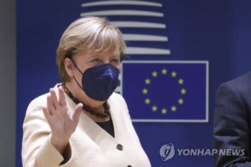 Germany's Chancellor Angela Merkel arrives for a round table meeting at an EU summit in Brussels, Thursday, Oct. 21, 2021. European Union leaders head into a standoff between Poland and most of the other EU member nations over the rule of law in the eastern member state. Other issues for the 27 EU leaders include climate change, the energy crisis, COVID-19 developments and migration. (Yves Herman, Pool Photo via AP) POOL PHOTO
