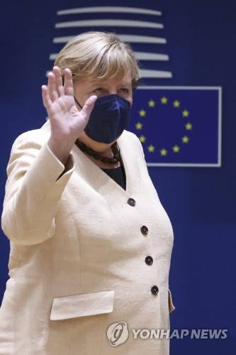 Germany's Chancellor Angela Merkel arrives for a round table meeting at an EU summit in Brussels, Thursday, Oct. 21, 2021. European Union leaders head into a standoff between Poland and most of the other EU member nations over the rule of law in the eastern member state. Other issues for the 27 EU leaders include climate change, the energy crisis, COVID-19 developments and migration. (Yves Herman, Pool Photo via AP) POOL PHOTO