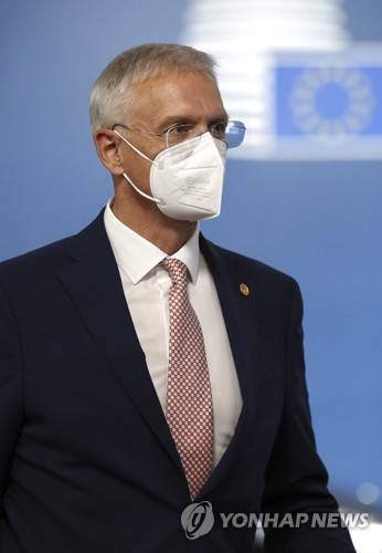 Latvia's Prime Minister Krisjanis Karins arrives for an EU summit at the European Council building in Brussels, Thursday, Oct. 21, 2021. European Union leaders will discuss issues including climate change, the energy crisis, COVID-19 developments and migration. (AP Photo/Olivier Matthys, Pool) POOL PHOTO