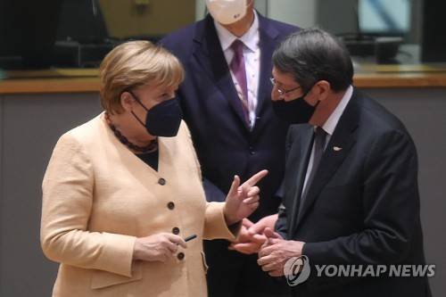 epa09536203 Germany's Chancellor Angela Merkel (L) talks with Cyprus' President Nicos Anastasiades prior a roundtable meeting during a European Union (EU) summit at The European Council Building in Brussels, Belgium, 21 October 2021, as EU leaders discuss Covid-19, digital transformation, energy prices, migration, trade and external relations. EPA/JOHN THYS / POOL