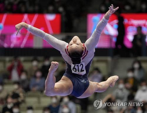 epa09536224 Leanne Wong of the United States performs on the Balance Beam during the Women's All-Around Final at the 50th FIG Artistic Gymnastics World Championships in? Kitakyushu, Japan, 21 October 2021. EPA/KIMIMASA MAYAMA