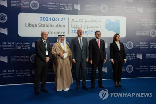 epa09536231 (L-R) Greece Foreign Minister Nikos Dendias, Kuwaiti Foreign Minister Sheikh Ahmed Nasser Al-Mohammed Al-Sabah, Greek Deputy Minister of Foreign Affairs Konstantinos Fragogiannis, Libyan Prime Minister Abdul-Hamid Dbeibah, and Libyan Foreign Minister Najla al-Mangoush line up for a photo as they attend the Tripoli Summit, in Tripoli, Libya, 21 October 2021. The Libya Stabilisation Initiative meeting organised by Tripoli to get the crisis-recovery process back on track could lead elections slated for 24 December to be put off. EPA/Nada Harib