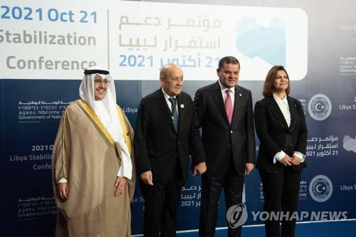 epa09536234 (L-R) Kuwaiti Foreign Minister Sheikh Ahmed Nasser Al-Mohammed Al-Sabah, French Foreign Minister Jean-Yves Le Drian, Libyan Prime Minister Abdul-Hamid Dbeibah and Libyan Foreign Minister Najla al-Mangoush line up for a photo as they attend the Tripoli Summit, in Tripoli, Libya, 21 October 2021. The Libya Stabilisation Initiative meeting organised by Tripoli to get the crisis-recovery process back on track could lead elections slated for 24 December to be put off. EPA/Nada Harib