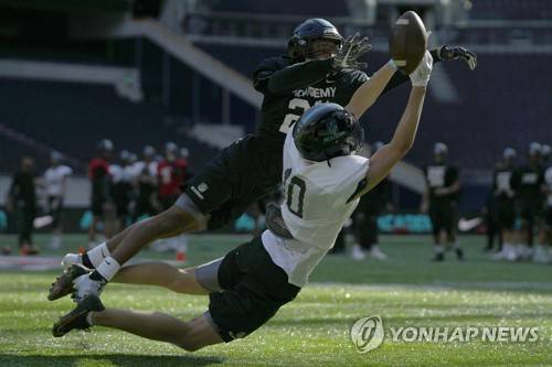 Wide receiver Enno Tennstedt, foreground, has the ball knocked away by running back Maurice Baker during an NFL Academy training session at Tottenham Hotspur's White Hart Lane stadium in London, Wednesday, Oct. 13, 2021. The NFL is playing two regular season games in London during October, the Jets verses the Falcon's and the Dolphins against the Jaguars. The NFL Academy is aimed at pre college youngsters to give them a chance show off their talents in a days events. (AP Photo/Alastair Grant)
