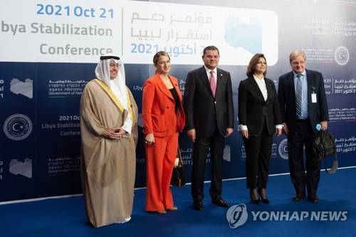 epa09536255 (L-R) Kuwaiti Foreign Minister Sheikh Ahmed Nasser Al-Mohammed Al-Sabah, an unidentified member of the US delegation, Libyan Prime Minister Abdul-Hamid Dbeibah, Libyan Foreign Minister Najla al-Mangoush, and US Ambassador to Libya Richard Norlands line up for a photo as they attend the Tripoli Summit, in Tripoli, Libya, 21 October 2021. The Libya Stabilisation Initiative meeting organised by Tripoli to get the crisis-recovery process back on track could lead elections slated for 24 December to be put off. EPA/Nada Harib